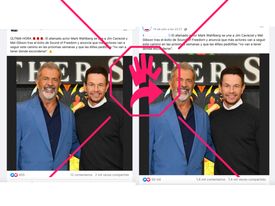 “El afamado actor Mark Wahlberg se une a Jim Caviezel y Mel Gibson tras el éxito de Sound of Freedom y anuncia que más actores van a seguir este camino en las próximas semanas y que las élites pedófilas ‘no van a tener donde esconderse", dicen publicaciones que suman más de 50,000 reacciones y 1,400 comentarios en Facebook. Caviezel es el protagonista de la mencionada película y Gibson ha recomendado verla.
