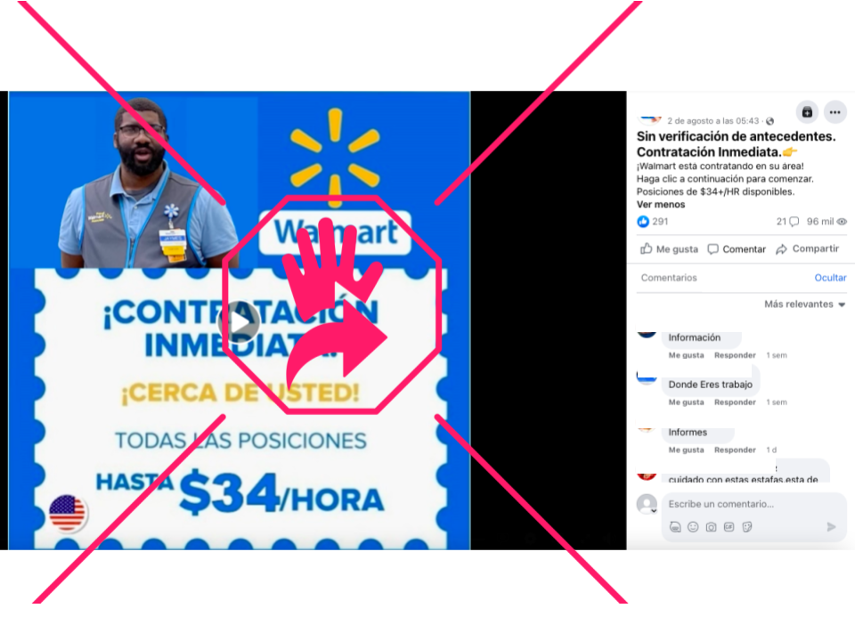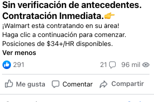 Una publicación que circula en Facebook en forma de anuncio asegura falsamente que Walmart “está contratando en su área” de forma “inmediata” y “sin verificación de antecedentes”, pero se trata de un caso de phishing (una ciberestafa que busca que las personas entreguen datos sensibles con el objetivo de venderlos a terceros, robarles o suplantar su identidad). La cadena de tiendas explicó a elDetector que no tiene nada que ver con ese post y que todas sus nuevas contrataciones en Estados Unidos deben pasar una verificación de antecedentes penales.
