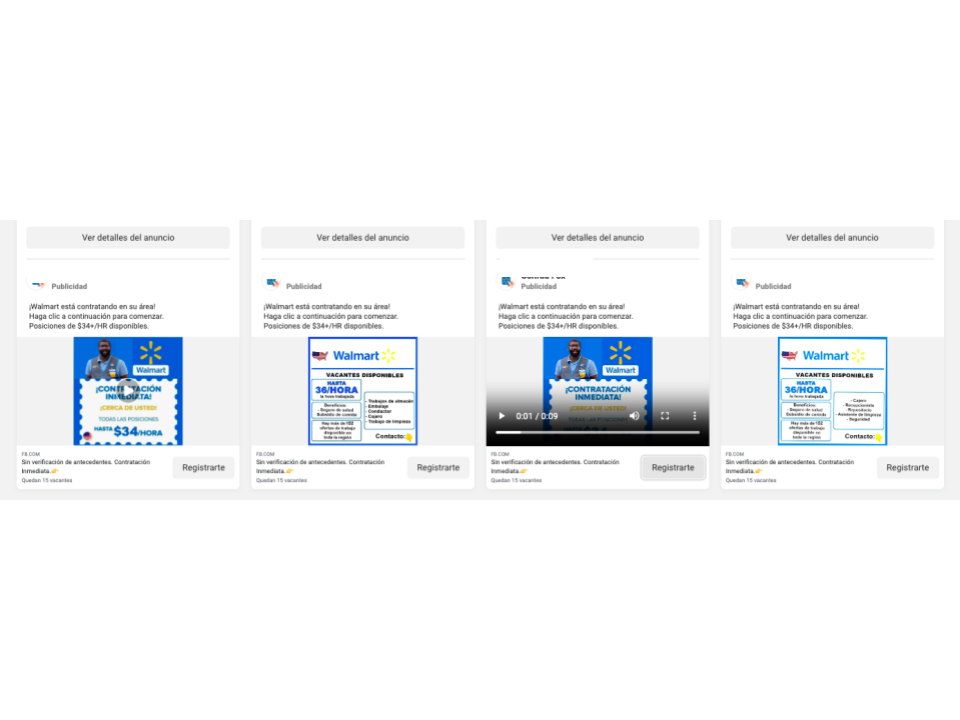 “Sin verificación de antecedentes. Contratación Inmediata. ¡Walmart está contratando en su área! Haga clic a continuación para comenzar. Posiciones de $34+/HR disponibles”, dice el texto de la publicación, que también incluye un video en el que una persona que parece estar vestida con un uniforme de la cadena llama a los usuarios a registrarse “ahora usando el botón de abajo”. La grabación sumaba 96,000 reproducciones hasta el 14 de agosto de 2023.