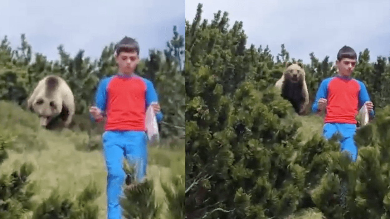 12-year-old boy remains calm as gigantic bear creeps behind him