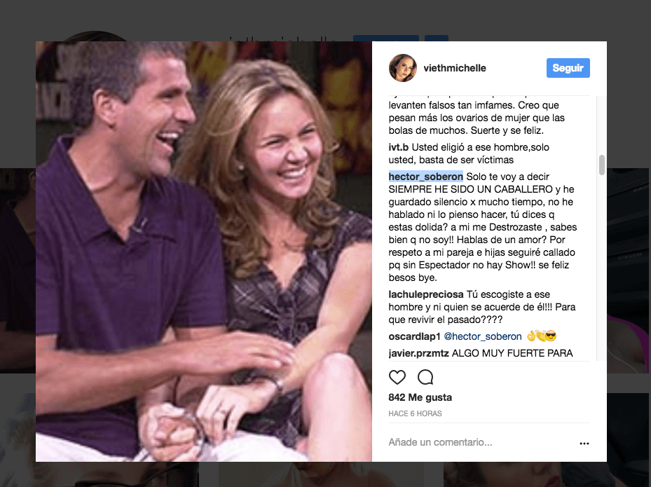 En redes sociales Soberón también dejó un mensaje en la cuenta de Michelle Vieth: "por respeto a mi esposa y a mis hijas seguiré callado, porque sin espectador no hay show", escribió a la actriz.