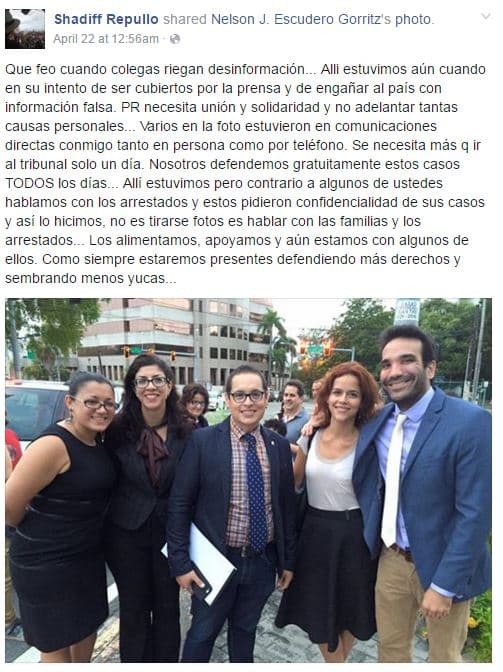 "Este grupo de abogad@s solidarios asumió sin retraso la defensa legal de l@s manifestantes pro-legalización. Qué bueno saber que actúan lo que predican., publicó en Facebook Nelson J. Escudero.