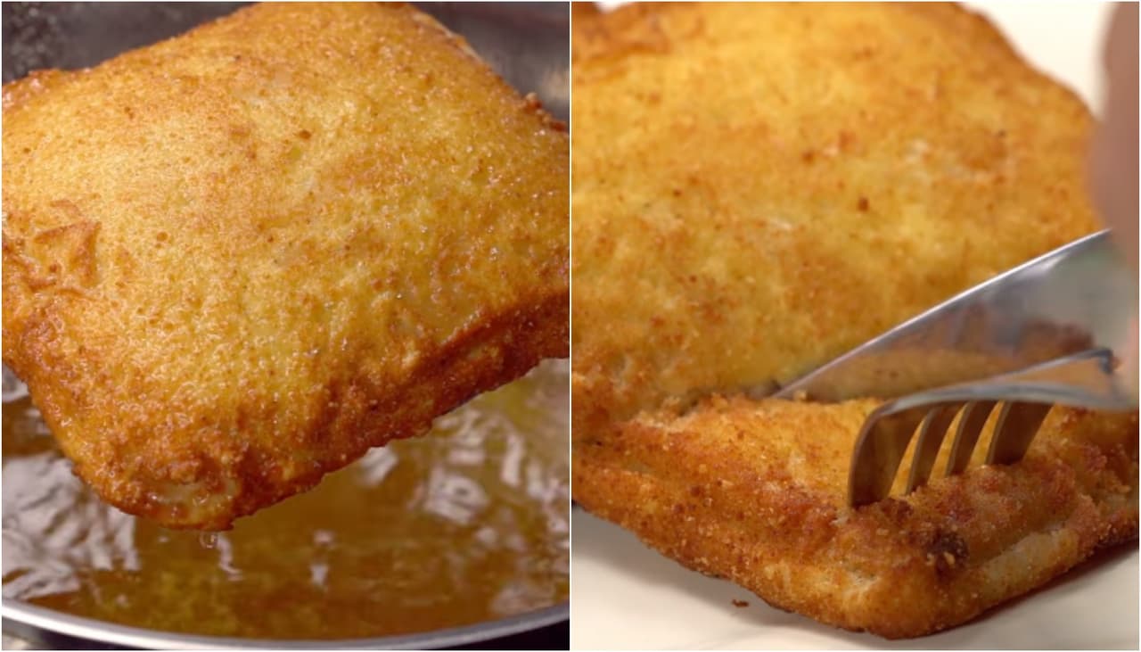 Em seguida, faça o empanado com o pão de forma passando primeiro pela farinha de trigo, depois pelo ovo batido e, por último, pela farinha de rosca. Frite por imersão em óleo quente e pronto.
