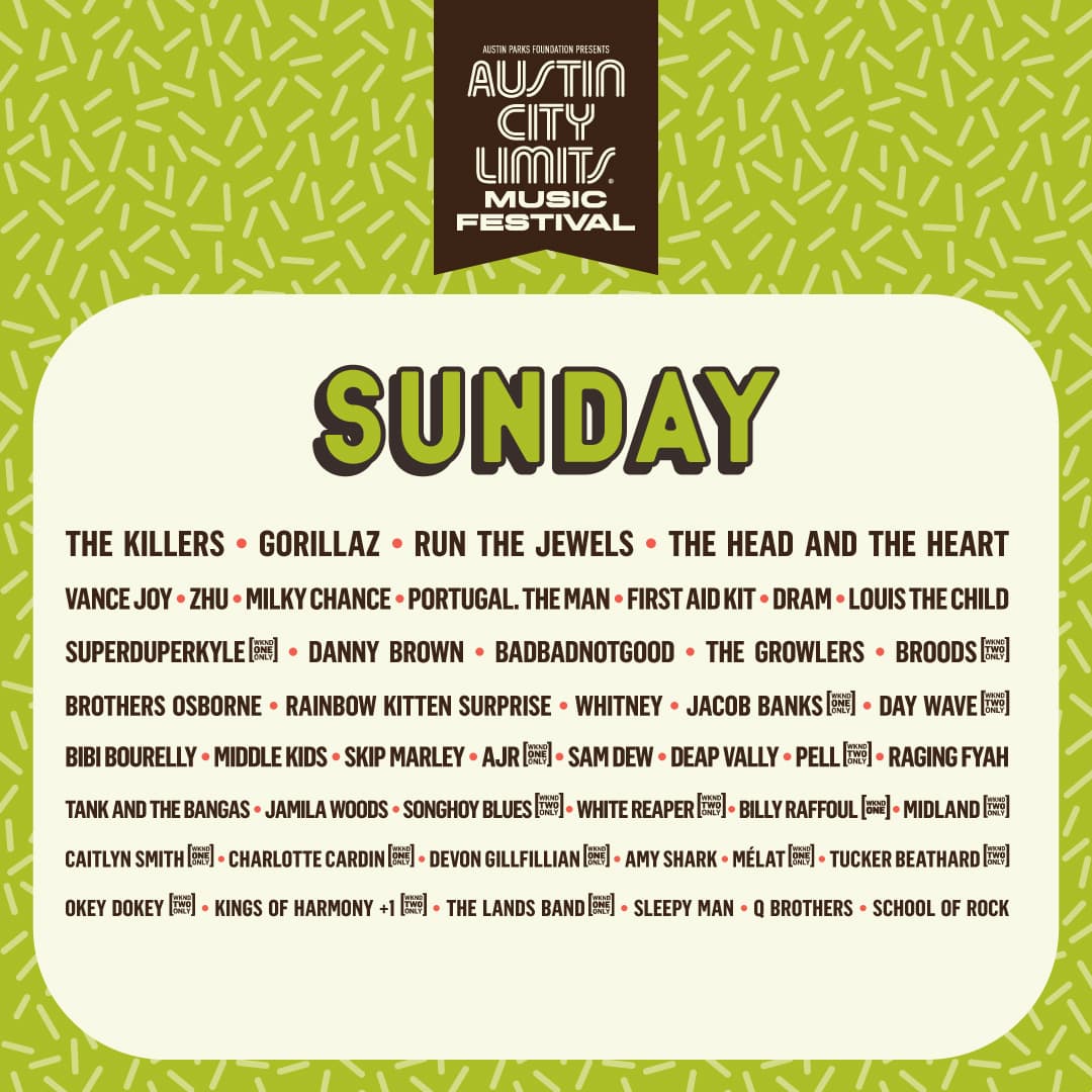 Eventos LocalesAustin City Limits Music Festival 2017 Line-upThe line-up for ACL has finally been revealed! Check out who and when they're performing. Por:UnivisionPUBLICIDAD1/3ACLPUBLICIDAD2/3ACLPUBLICIDAD3/3ACLPUBLICIDADRelacionados:Eventos LocalesHip HopLocalPUBLICIDADNuestro streaming gratis y en español. Entretenimiento sin límites, en vivo y on-demandGratisGratisGratisGratis¿Quieres ver todo el catálogo de contenidos?ir a ViX