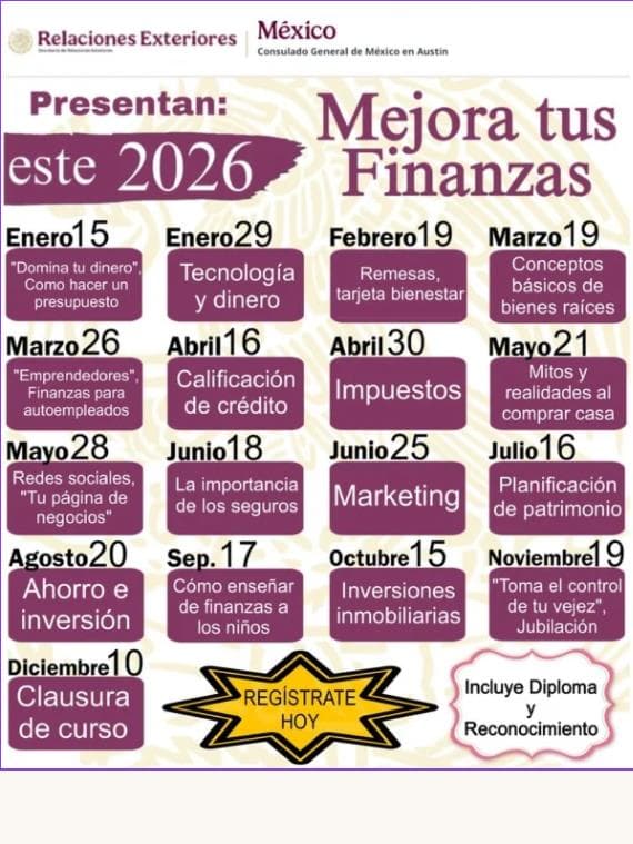 El Consulado General de México en Austin te invita este 2026 al programa MEJORA TUS FINANZAS 💡