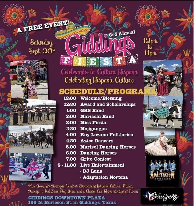 Acompáñanos al tercer evento anual de Giddings Fiesta este 20 de Septiembre, celebrando la cultura Hispana!!