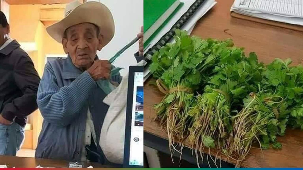 A falta de dinero, humilde abuelito paga su acta de nacimiento con cilantro