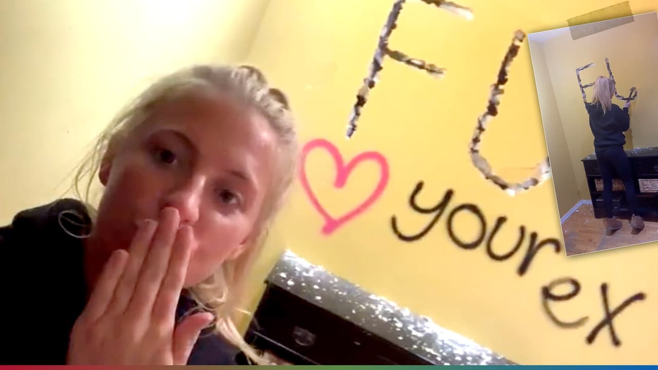 "FU your ex", escribió la joven con un martillo y pintura de aerosol en lo que parece ser la pared de la casa de su exnovio, con lo que muestra que las cosas no terminaron bien.