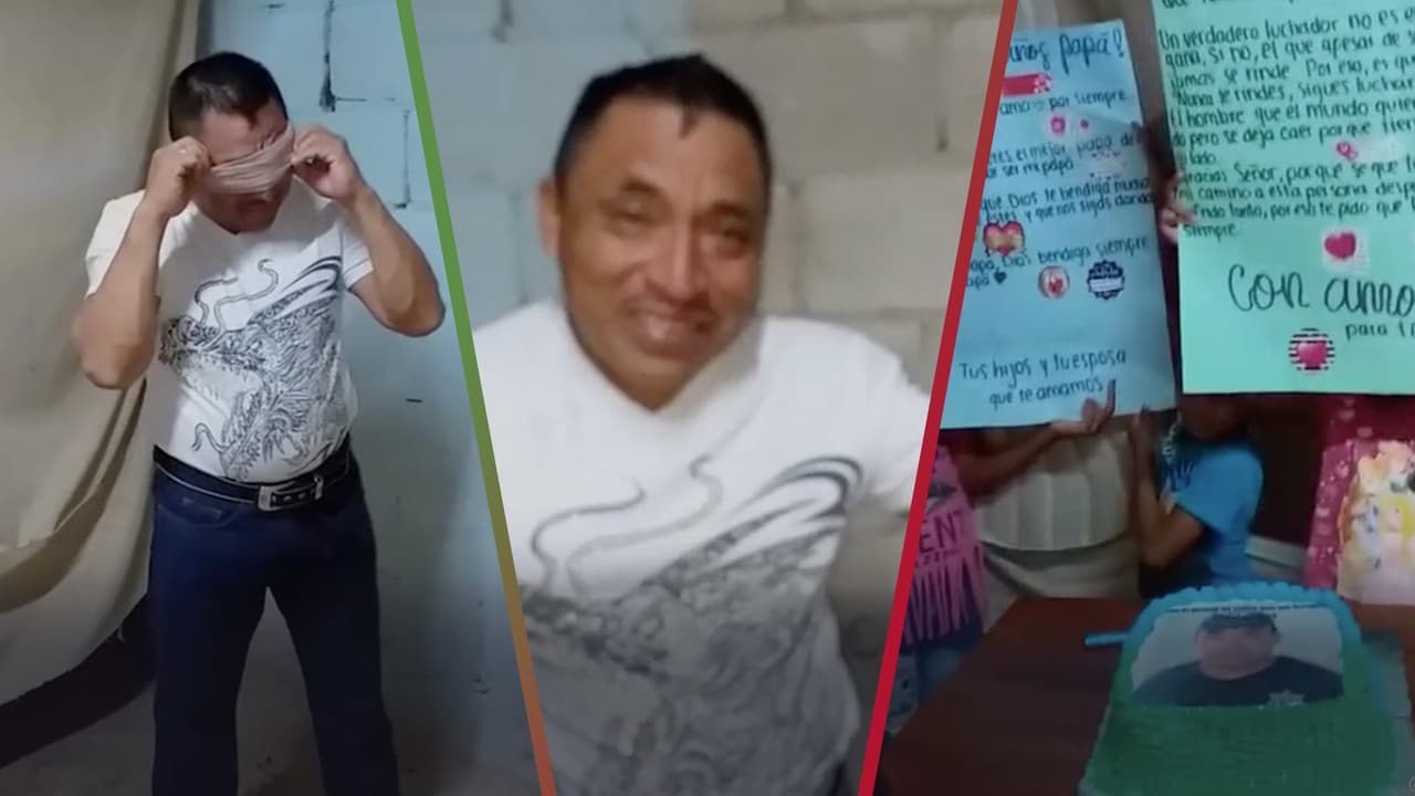 "Es mi primer pastel": Hombre llora de alegría al ser sorprendido por su esposa e hijos por su cumpleaños