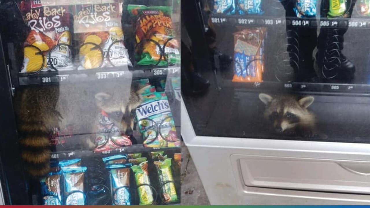 El mapache fue sorprendido 'con las manos en la masa' dentro de la máquina expendedora de snacks en una escuela preparatoria de Florida.