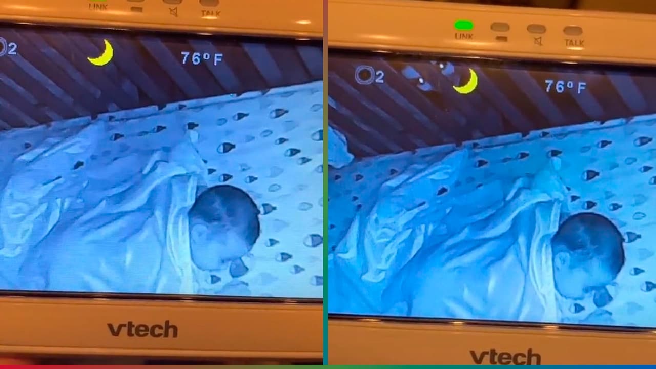 Esta usuaria de TikTok, compartió el video captado por un monitor, en el que se ve dormir al pequeño plácidamente, mientras una extraña presencia lo observa de forma siniestra.