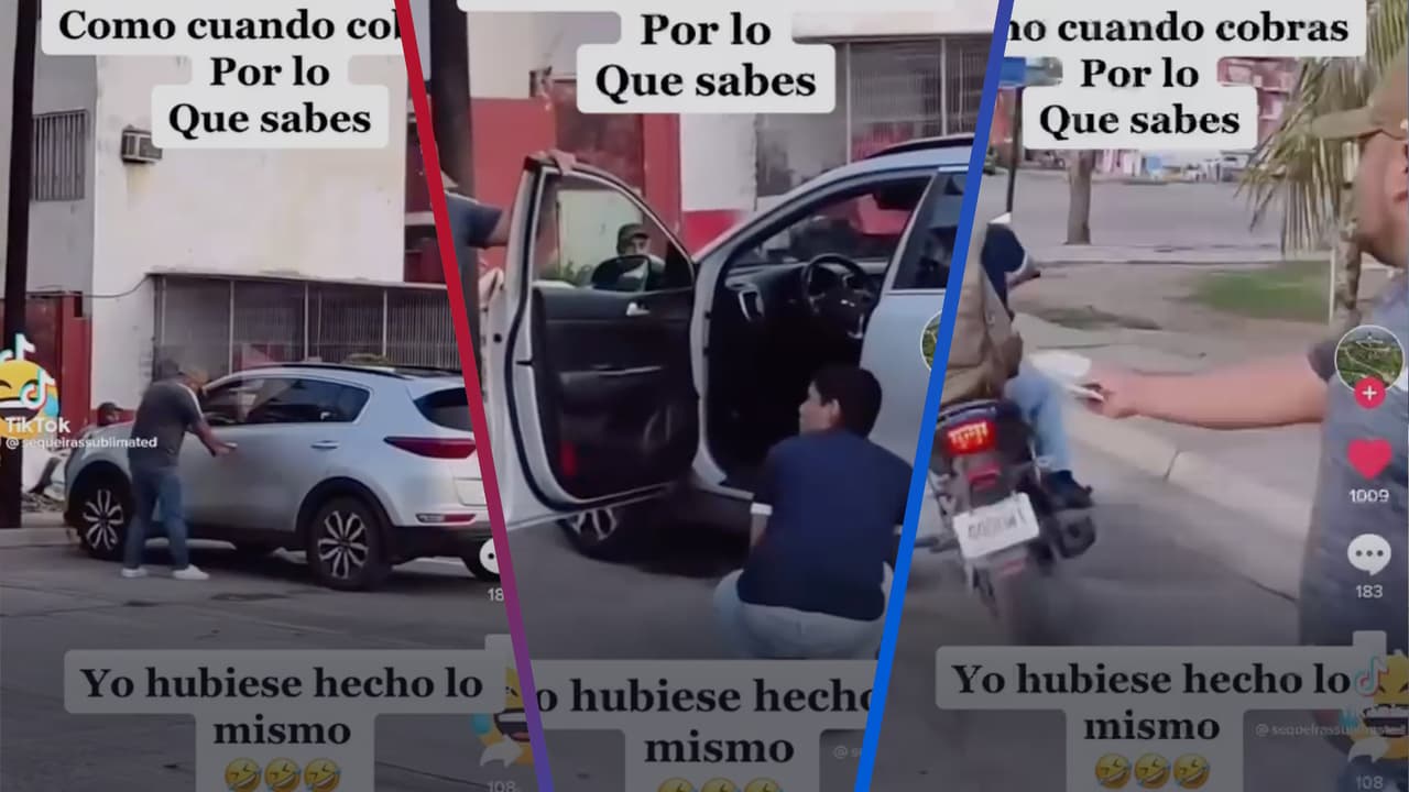 El video muestra cómo el trabajador llega y abre la puerta del auto en segundos, y al intentar recibir el pago de 400 pesos por su labor, el cliente se niega y le ofrece menos.