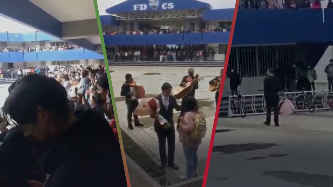 Las imágenes muestran cómo el joven, vestido de traje y junto a un mariachi, llega al plantel en Oaxaca y tras ser rechazado por la chica, se retira y deja el ramo de flores en el piso.