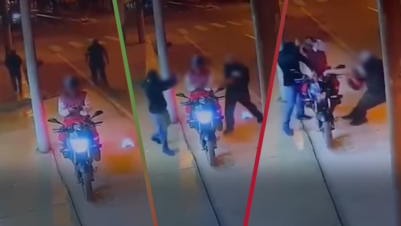 Cámara de seguridad capta el momento en que dos sospechosos se acercan a un repartidor en una motocicleta para asaltarlo, y uno de ellos dispara su pistola sin querer, matando al instante a su acompañante.