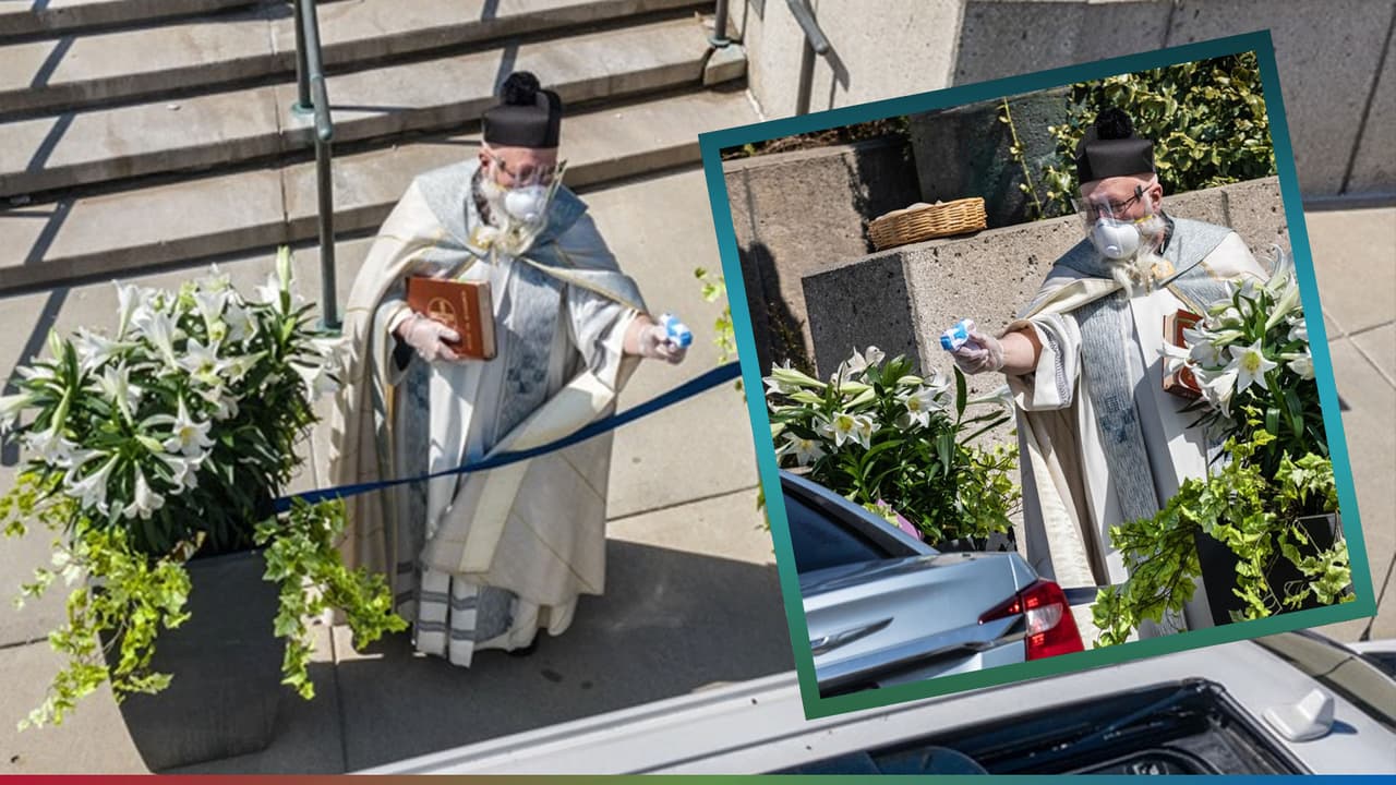 El padre Tim Pelc, se las ingenió para cumplir con su servicio religioso sin quebrantar el distanciamiento social, aunque para algunos esta situación fue bastante graciosa.