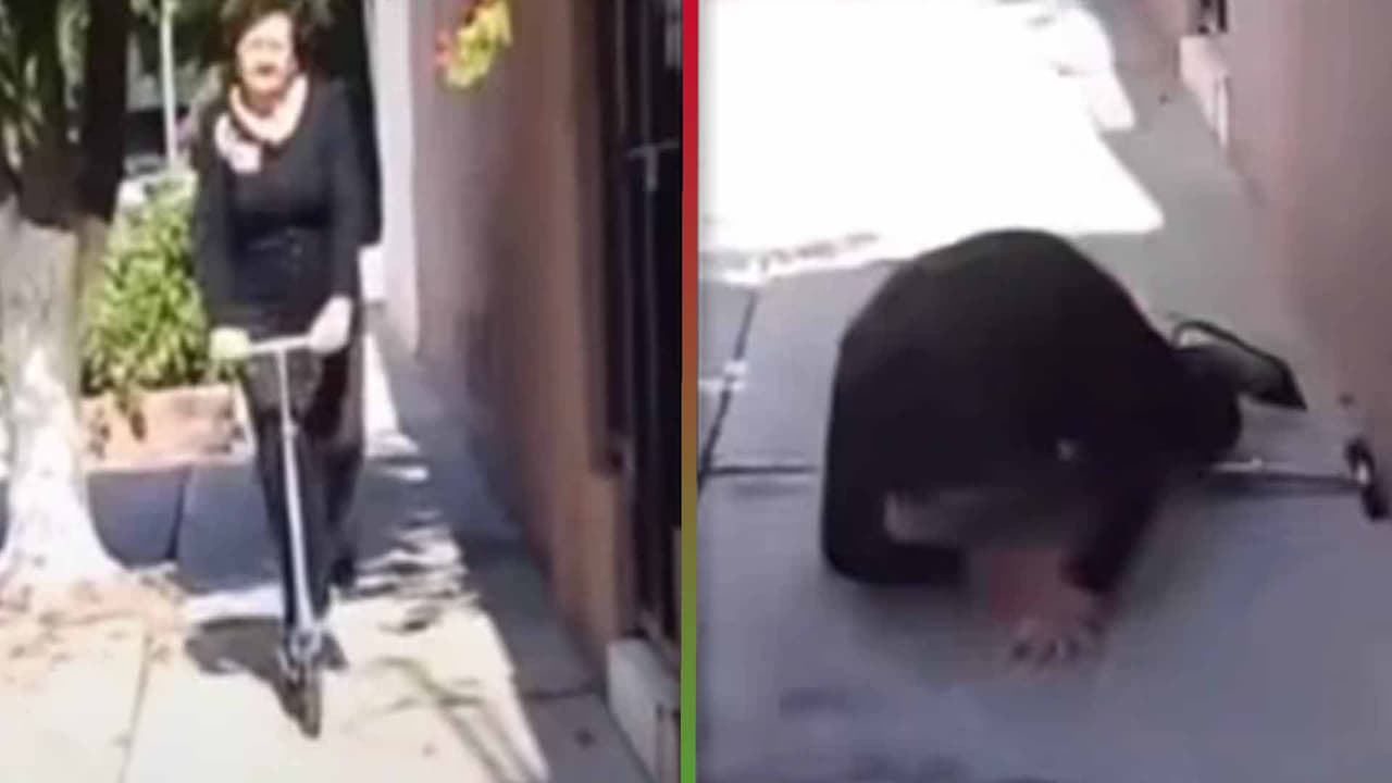 En TikTok, se popularizó el video de una anciana llamada Marta, que paseaba en el patín por la banqueta cuando se topó con un obstáculo perdiendo el equilibrio.