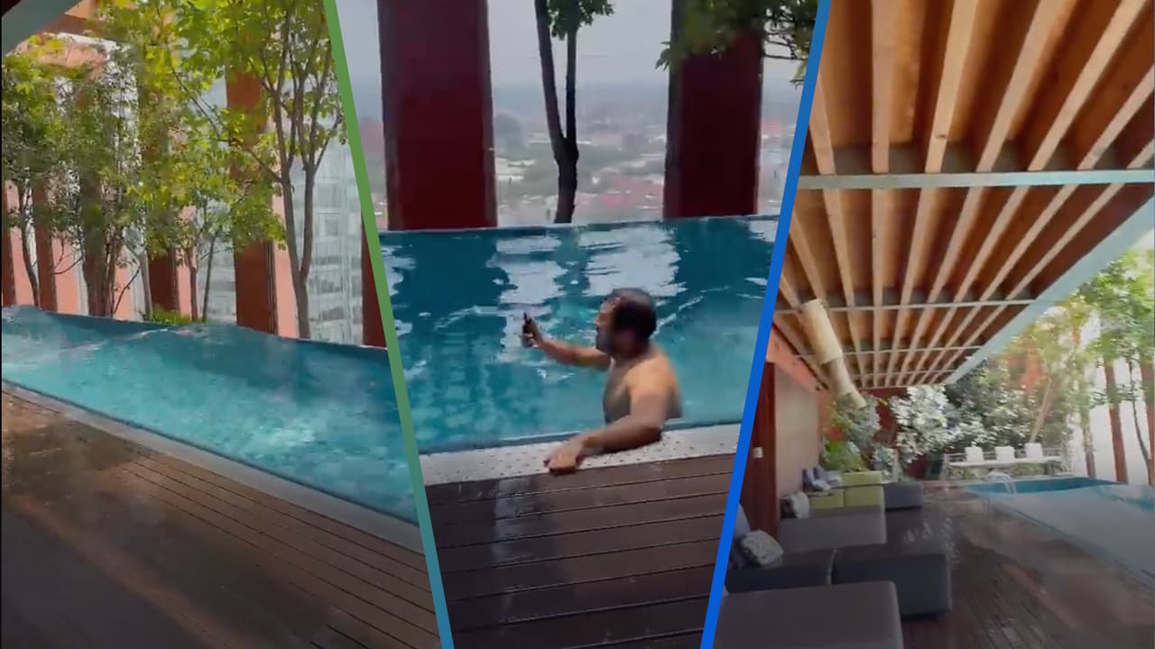 El video, que se hizo viral tras el terremoto de magnitud 7.6 que sacudió diferentes partes del país, muestra al hombre en una piscina como si nada, en el último piso de un edificio en Reforma.