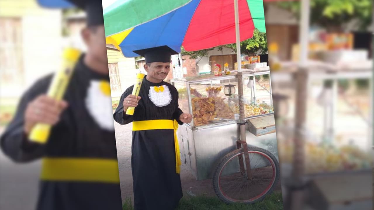 Luego de 10 años de arduo trabajo, el hombre decidió festejar su graduación de la carrera de letras, junto al carrito de golosinas que le ayudó a pagar sus estudios y mantener a su familia.