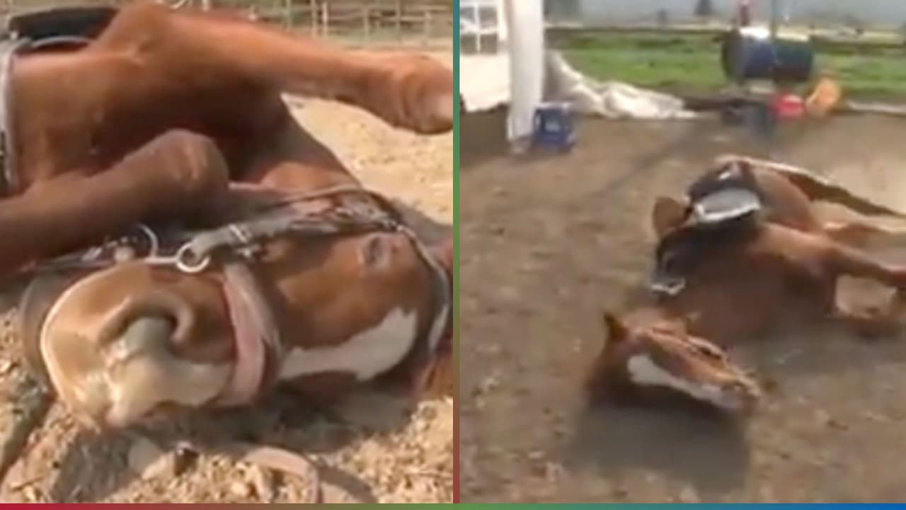 Como si se tratará de una escena de película, este singular equino finge estar muerto para no tener que cargar a ningún jinete.