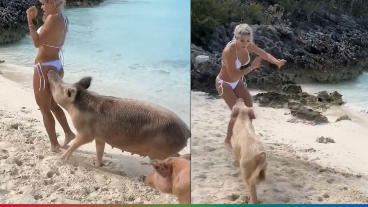 'La Playa de los Cerdos' es conocida porque ahí habitan varios marranos que la gente alimenta mientras nadan con ellos; sin embargo, uno de estos no aguantó e hizo de las suyas con la modelo y entrenadora Michelle Lewin.