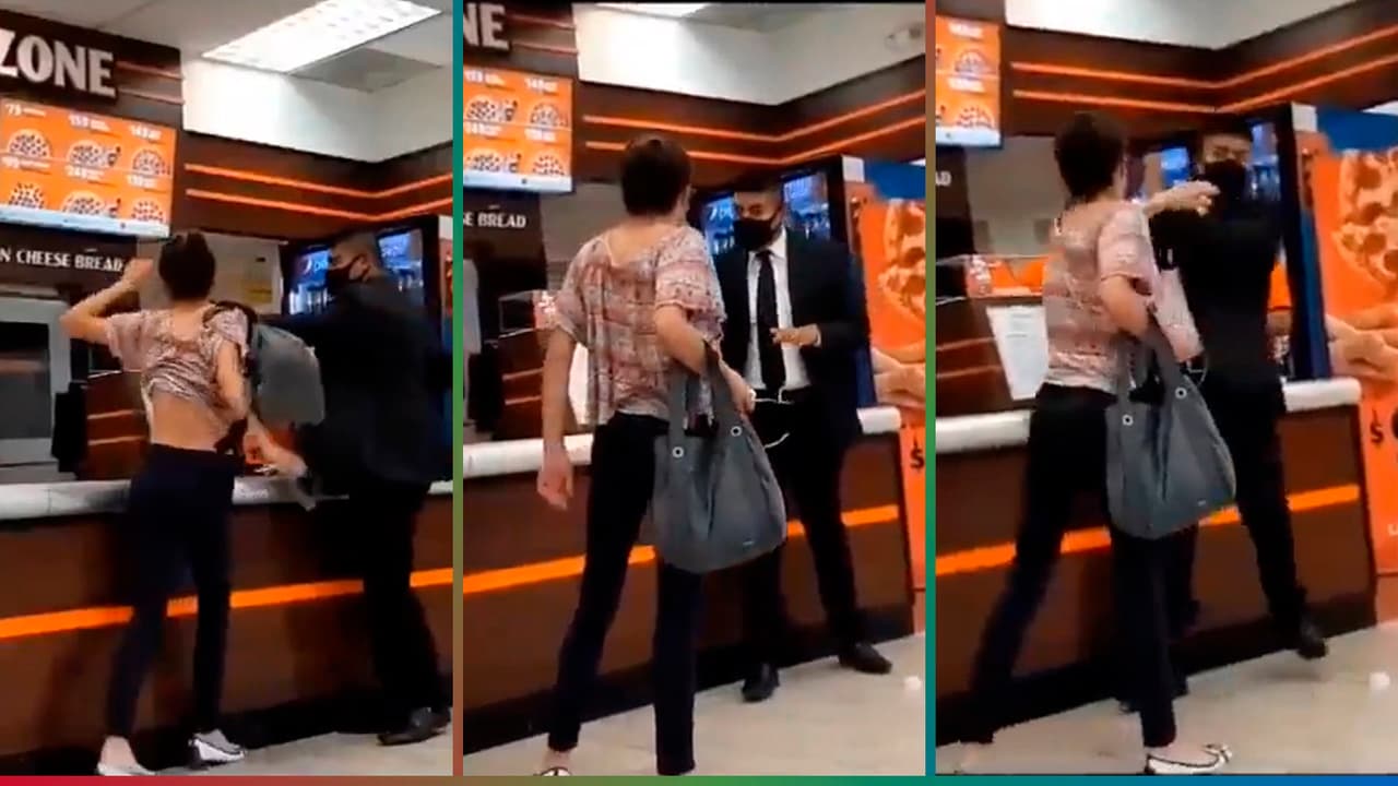 (Video) Entre golpes e insultos, mujer estalla enfurecida porque no le quieren vender una pizza por supuestamente no traer cubrebocas