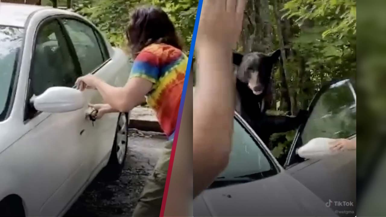 Video muestra a joven tratando de sacar un oso que estaba dentro de su auto