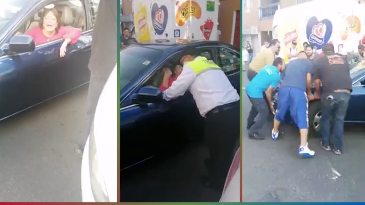(Video) Mueven a la fuerza el carro de una señora que se paró en medio de la calle y se negaba a cooperar