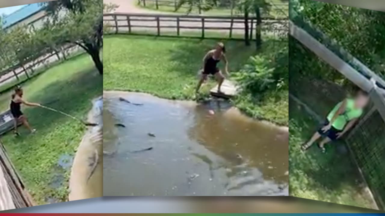 (Video) Mujer arriesga la vida de su hijo al ingresar a un estanque lleno de cocodrilos para recuperar su cartera