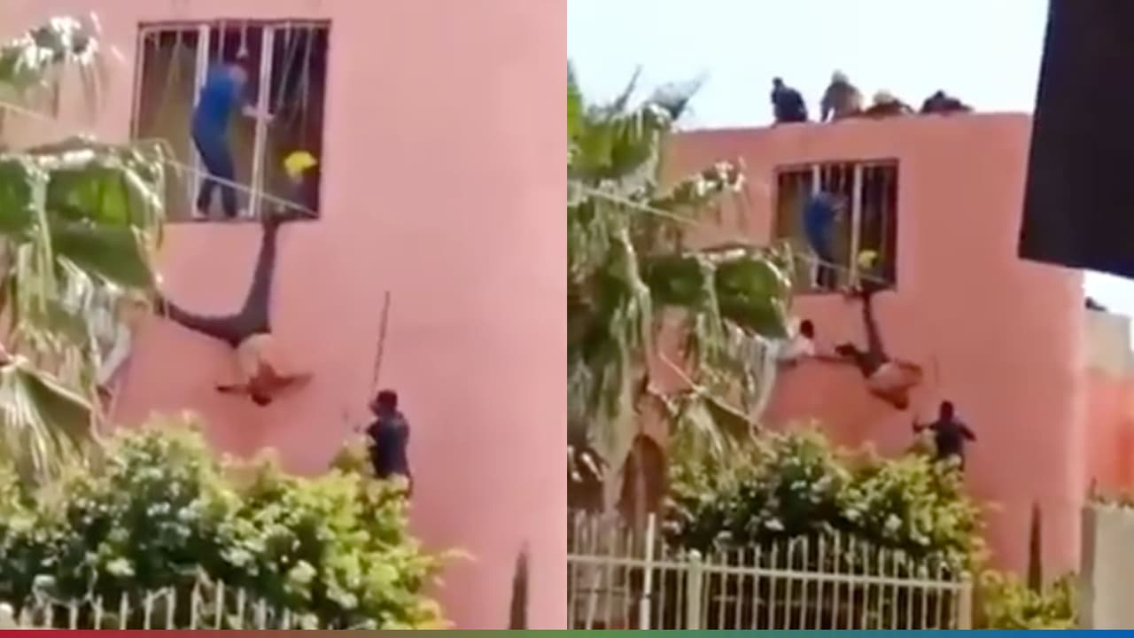 (Video) Policía agarra como piñata a ladrón que quedó colgando de una ventana