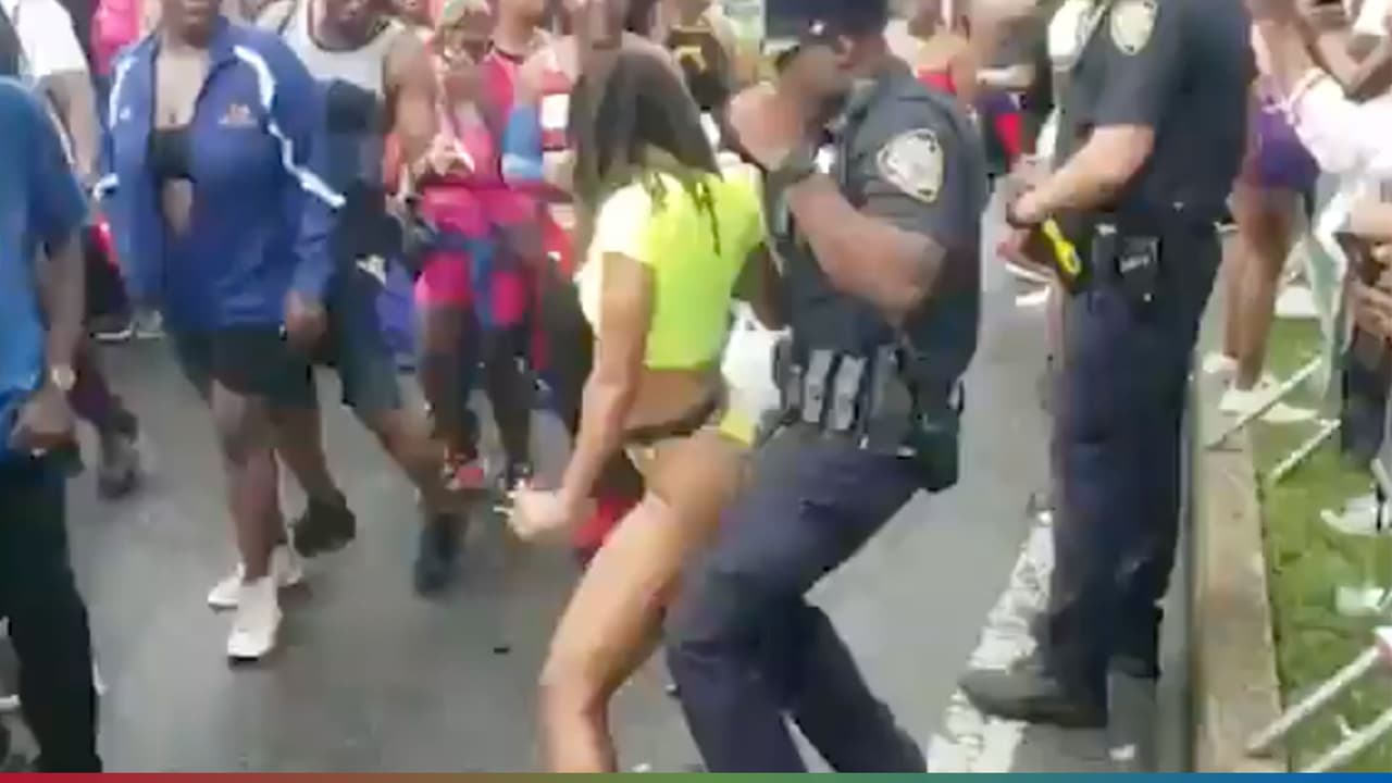 (Video) Policía es grabado perreando con una chava en tanga durante desfile en Nueva York