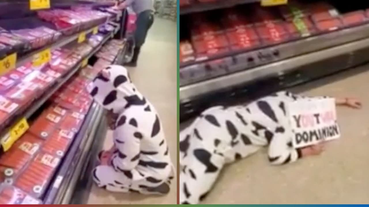 (Video) Vestida de vaca, mujer vegana protesta en un supermercado