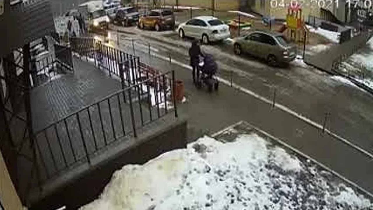 Según reportes de medios locales en Rusia, el sospechoso cayó arriba de la carriola que transportaba al pequeño y todo quedó grabado en un cámara de seguridad.