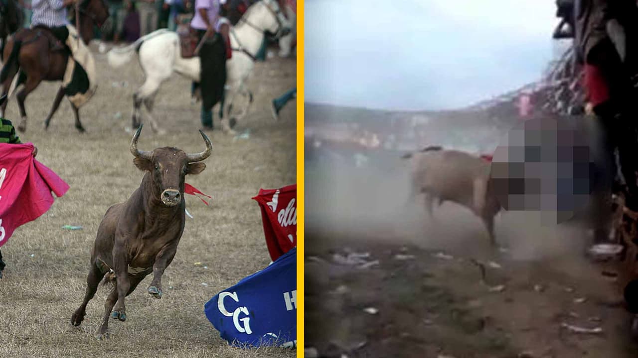 Las impresionante imágenes fueron captadas por decenas de personas, quienes presenciaron cómo el animal embiste al hombre y lo sacude por varios segundos en el aire, para luego arrojarlo al suelo sin vida.