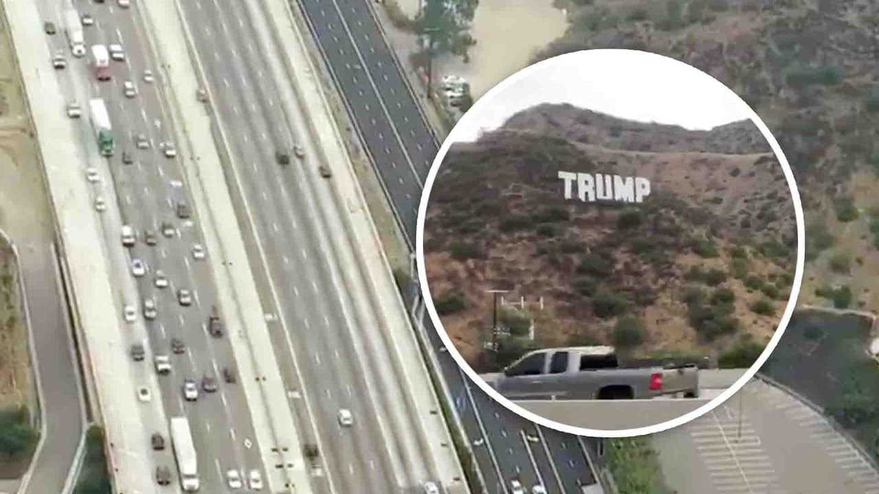 Imitando el emblemático anuncio en la capital del entretenimiento, los responsables colocaron a un costado de la autopista 405 en Los Ángeles, un letrero con las letras del apellido del mandatario, lo que causó controversia y las autoridades tuvieron que tomar cartas en el asunto.
