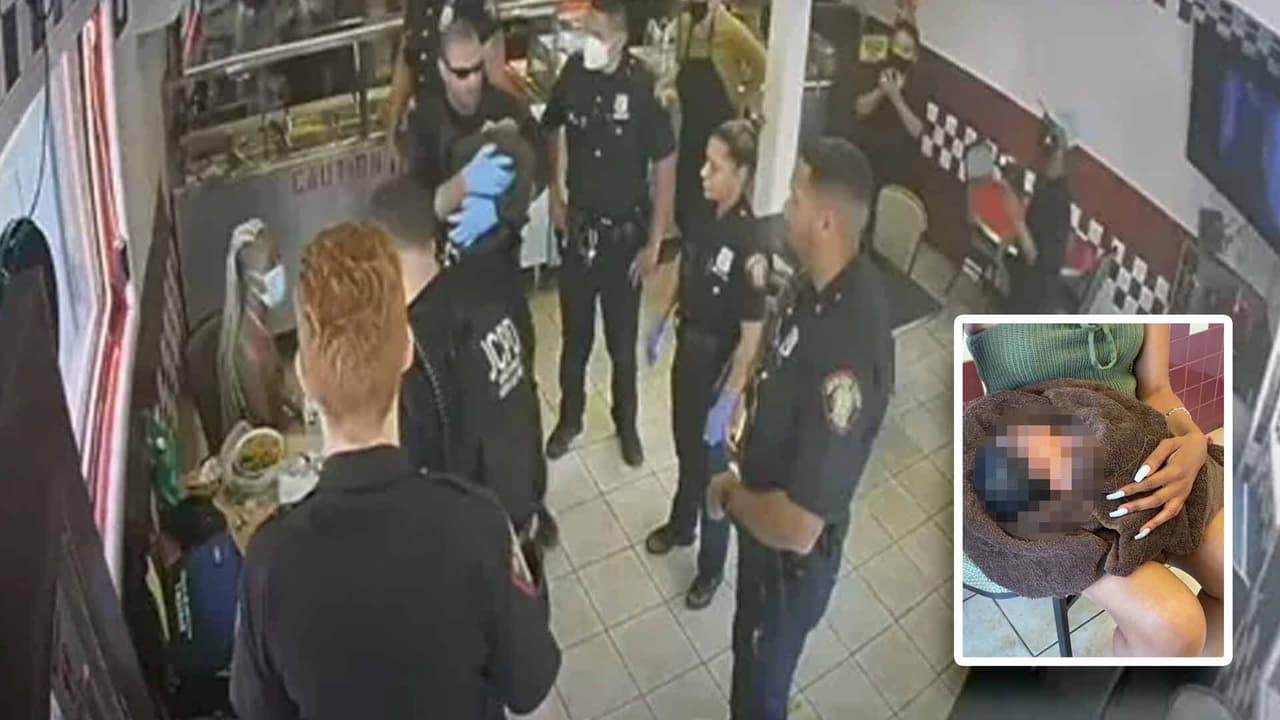 Las cámaras de seguridad captaron el momento en que la menor entra al establecimiento, se acerca al mostrador, alerta a un empleado sobre un recién nacido que encontró, quien aún traía el cordón umbilical conectado a su cuerpo, y deja al bebé en custodia de una pareja.