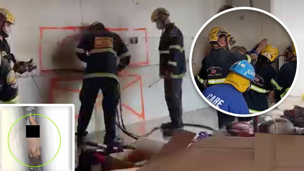 Con unos cuantos centímetros de espacio para respirar y con pocas fuerzas restante, luego de intentar liberarse por sí misma, la mujer indigente de Santa Ana pidió ayuda, lo que puso en alerta a los dueños del edificio, quienes llamaron a los rescatistas para romper el muro que la atrapaba.