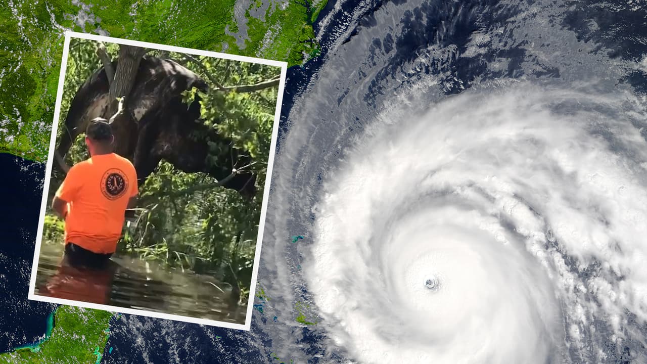 Las impresionantes imágenes, capturan cómo varias personas intentan liberar de un árbol al desesperado animal y dejan en evidencia los desastres que dejó este fenómeno natural a su paso por lugares como Louisiana.