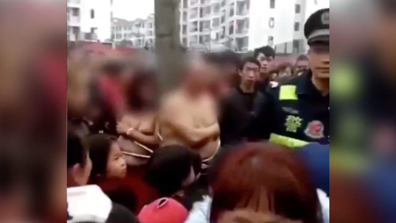 (Video) Mujer cacha a su esposo con su amante y los amarra a un poste aún desnudos