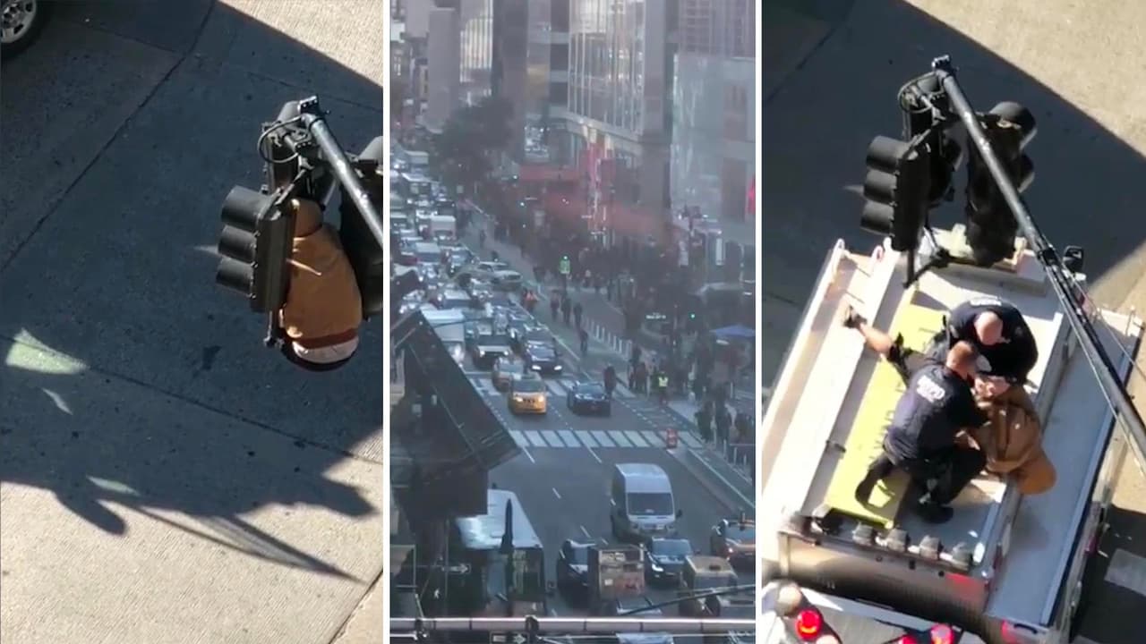 “Parecía una gárgola”: Hombre ocasionó caos en Nueva York al colgarse de un semáforo