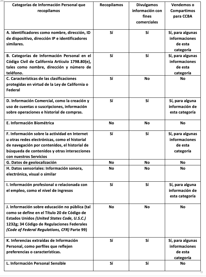 - Información personal que revelamos: Identificadores, Categorías de Información Personal en el Código Civil de California Artículo 1798.80(e), Información Comercial, Información sobre actividades en Internet o en red, Información profesional o relacionada con el empleo, Inferencias extraídas de información personal