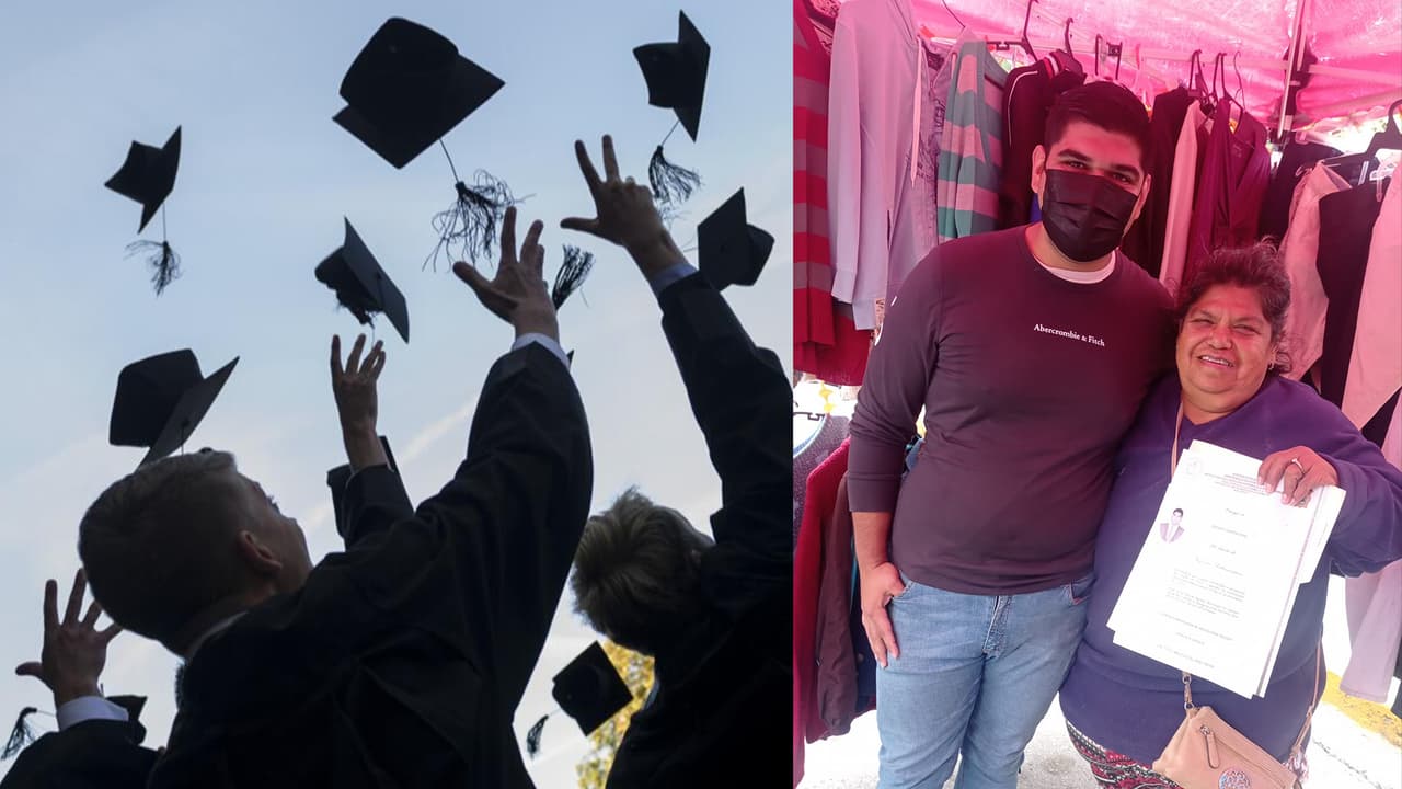 Ingeniero recién graduado reconoce el apoyo de su madre y posa con ella en su puesto de tianguis