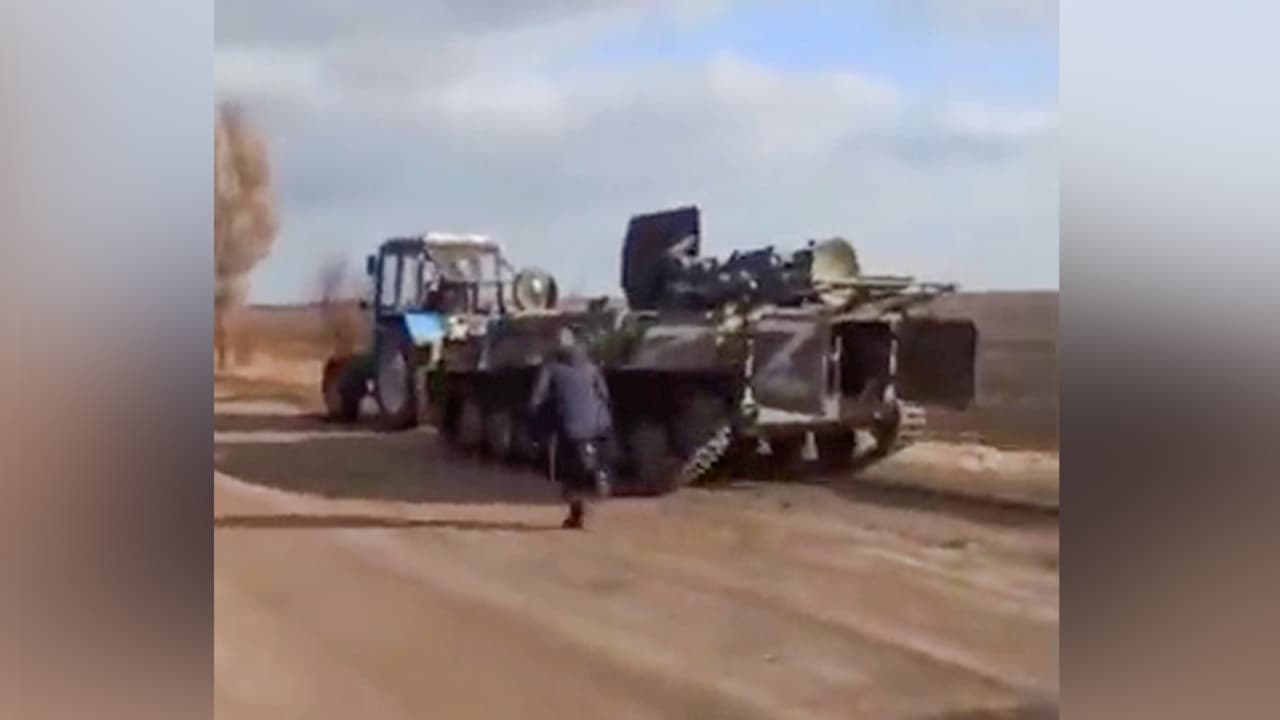 En redes sociales, han aparecido varios videos en donde se puede ver cómo con un tractor, algunos hombres se llevan un vehículo de guerra del ejército ruso.