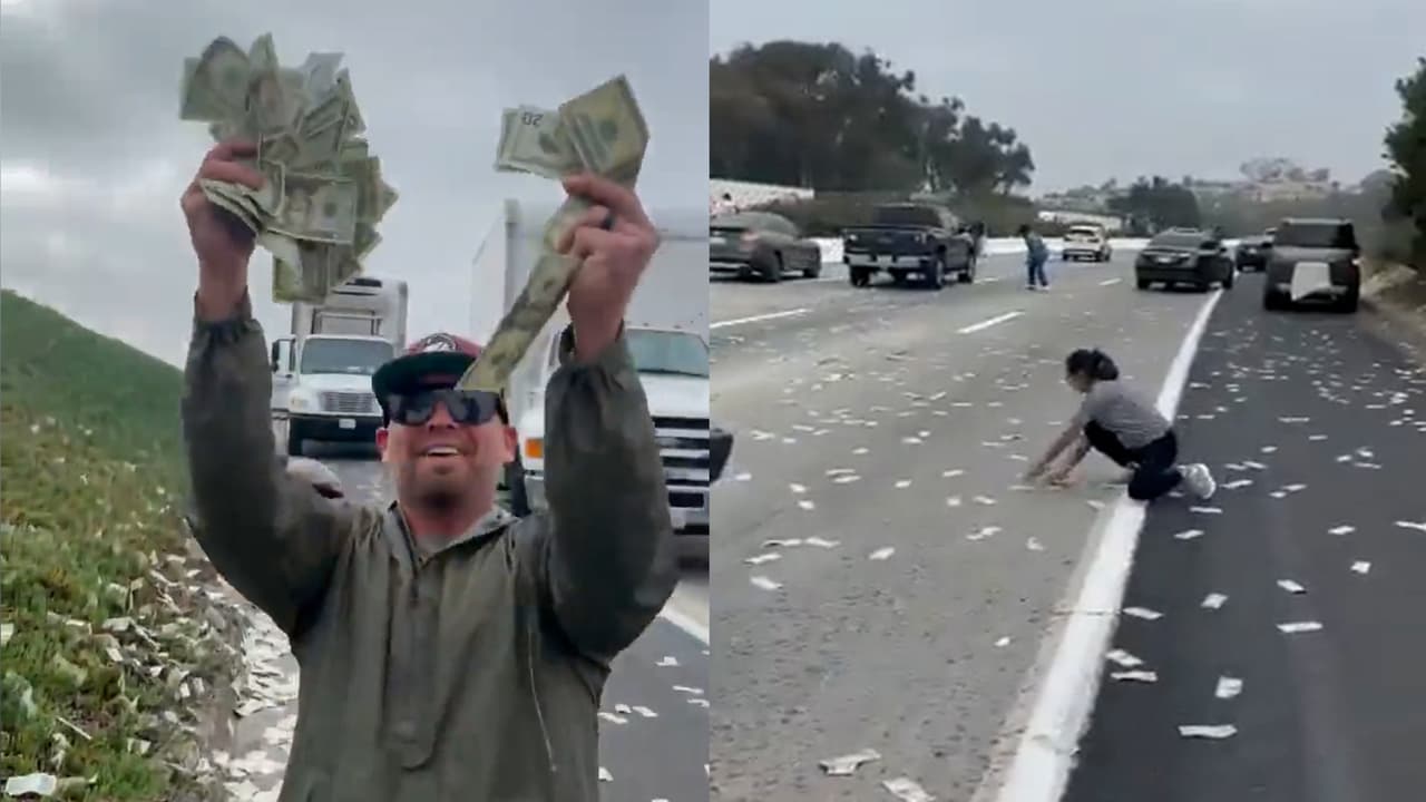 (Video) 'Llueve dinero': Camión blindado tira billetes en autopista de California y conductores se bajan a recogerlos (pero deben devolverlo)