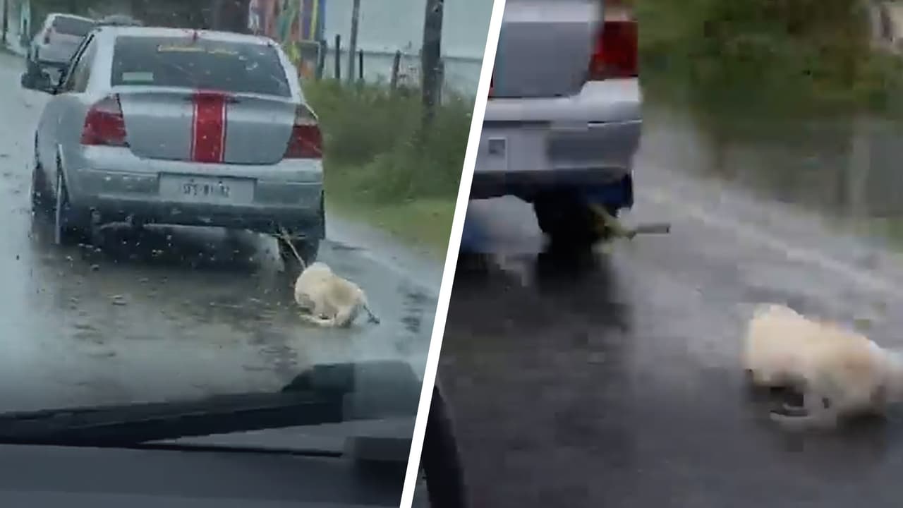 Una sociedad de protección animal, publicó un video en el que se puede ver al animal atado cerca al parachoques del auto, mientras su cuerpo es arrastrado contra el pavimento.