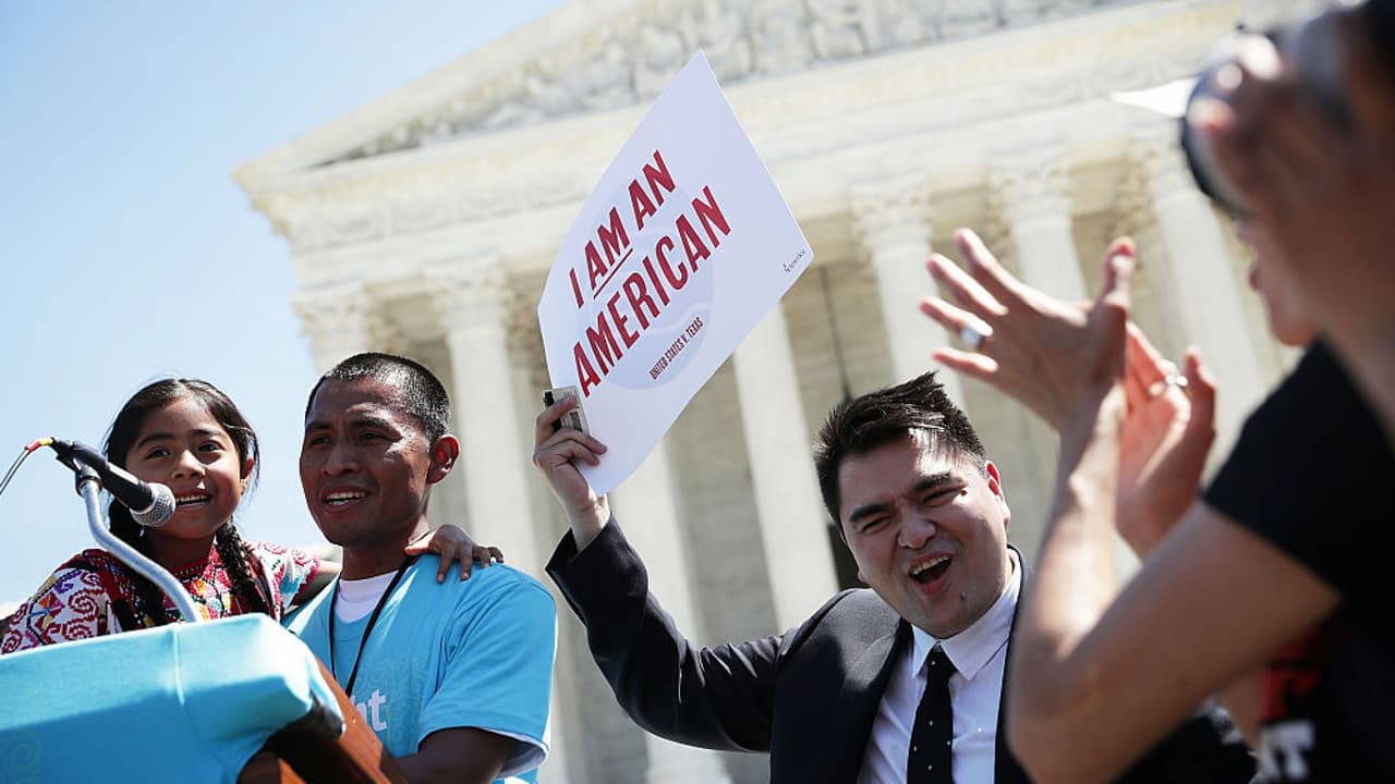 Activists and politicians gathered this morning in Washington as the Supreme Court heard arguments for and against Obama's use of executive action to implement his immigration programs, DACA and DAPA.