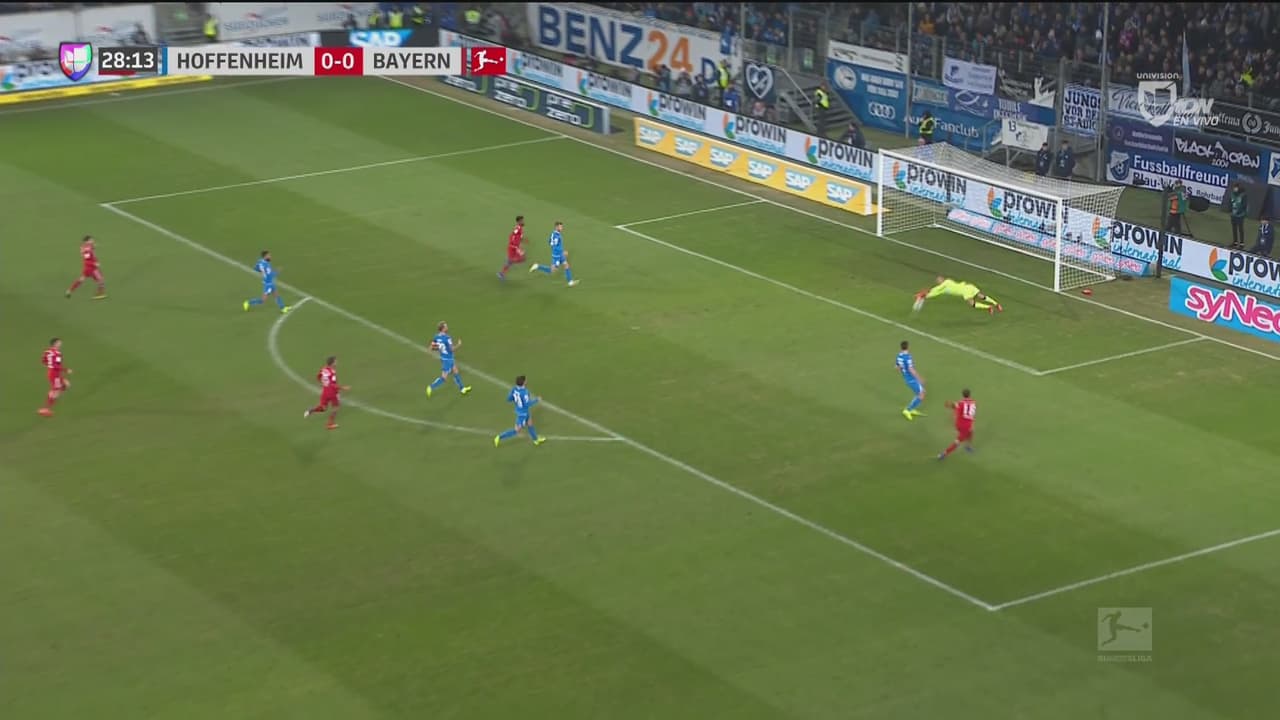 Balón a profundidad para León, quien a la entrada del área metió un potente disparo que el portero del Hoffenheim desvió a un costado al 29’.