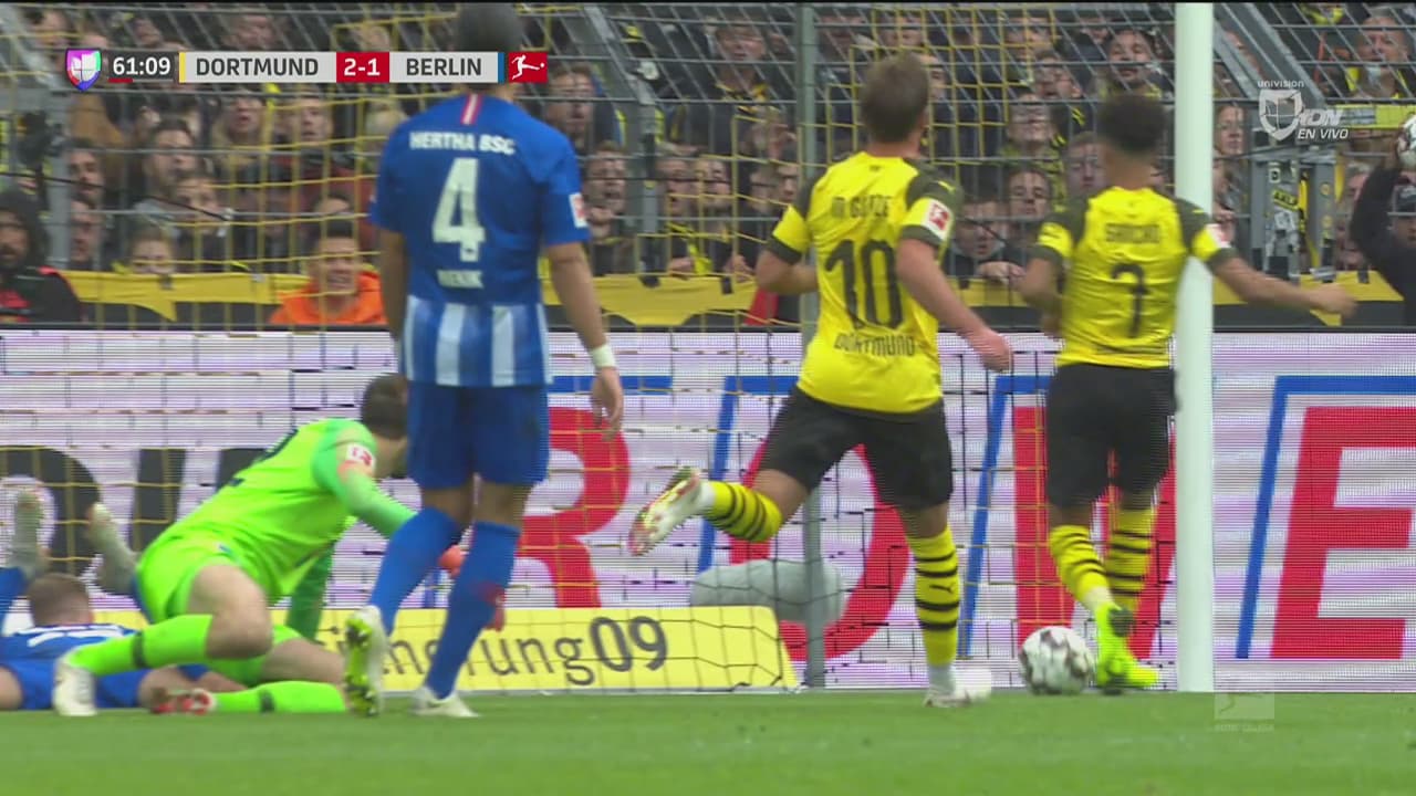 Una gran recuperación de Raphael Guerreiro y un pase cruzado que sutilmente termina desviando Marco Reus dejaron el balón servido para que Sancho tocara el esférico y lo mandara a guardar para el 2-1.