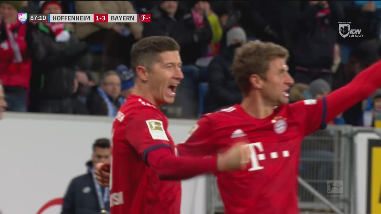 El volante colombiano tomó el balón a las afueras del área y metió un cambio de juego para Müller, quien de primera intención le cedió solo al ‘9’ polaco al 86’.