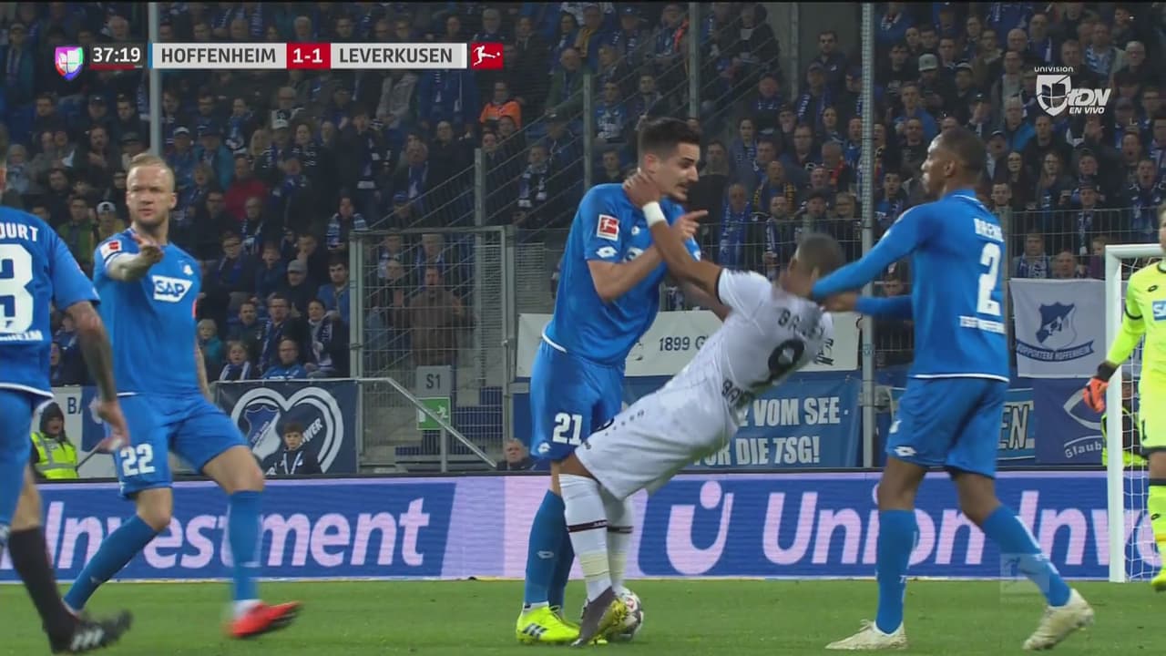 El delantero del Leverkusen no dejó que despejara el central del Hoffenheim, por lo que este último se calentó. Amarilla para ambos al 37’.