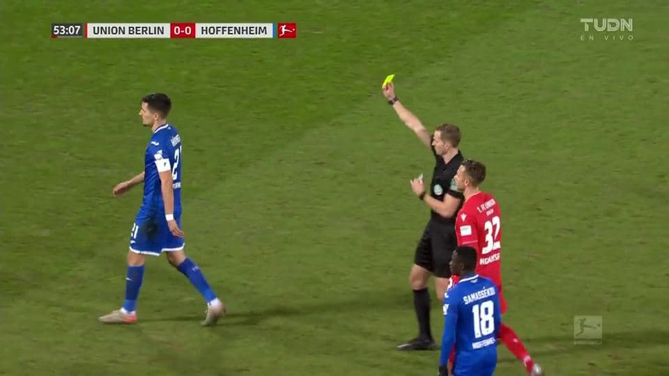 Tarjeta amarilla. El árbitro amonesta a Benjamin Hübner de TSG 1899 Hoffenheim